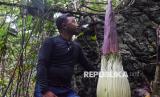 Pemandu melihat bunga bangkai (Amorphophallus Titanum) yang tumbuh di Desa Batu Katak, Bahorok, Langkat, Sumatera Utara, Sabtu (18/1/2025). Bunga bangkai setinggi 160 cm tersebut diperkirakan akan mekar dalam empat hari ke depan dan menjadi daya tarik wisatawan saat berkunjung di Desa Batu Katak. (FOTO : ANTARA FOTO/Fransisco Carolio)