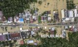 Foto udara sejumlah kendaraan terjebak kemacetan di Jalan Lintas Sumatera akibat banjir di Merlung, Tanjung Jabung Barat, Jambi, Senin (20/1/2025). Banjir akibat meluapnya Sungai Pengabuan di daerah itu menyebabkan jalan nasional yang menghubungkan Jambi dengan Riau itu lumpuh total sejak Ahad (19/1/2025) sore dengan ketinggian air mencapai 150 sentimeter.  (FOTO : ANTARA FOTO/Wahdi Septiawan)