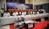 Para tersangka dan barang bukti dihadirkan saat konferensi pers kasus judi online di Gedung Bareskrim Mebes Polri, Jakarta, Senin (20/1/2025). Direktorat Tindak Pidana Siber Bareskrim Polri berhasil membongkar tiga kasus besar yang melibatkan situs judi online/daring dengan beberapa barang bukti dan uang senilai mencapai Rp 61 miliar serta mengamankan 11 tersangka. Ketiga situs tersebut adalah H5GF777, RGO Casino, dan Agen 138 yang beroperasi secara nasional dan internasional. (FOTO : Republika/Prayogi)