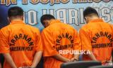 Para tersangka dihadirkan saat konferensi pers kasus judi online di Gedung Bareskrim Mebes Polri, Jakarta, Senin (20/1/2025). Direktorat Tindak Pidana Siber Bareskrim Polri berhasil membongkar tiga kasus besar yang melibatkan situs judi online/daring dengan beberapa barang bukti dan uang senilai mencapai Rp 61 miliar serta mengamankan 11 tersangka. Ketiga situs tersebut adalah H5GF777, RGO Casino, dan Agen 138 yang beroperasi secara nasional dan internasional. (FOTO : Republika/Prayogi)