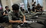 REPUBLIKA.CO.ID, JAKARTA -- Petugas merapikan barang bukti sitaan usai konferensi pers pengungkapan kasus investasi bodong di Bareskrim Polri, Jakarta, Rabu (22/1/2025).