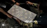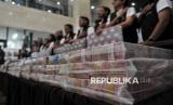 Petugas merapikan barang bukti sitaan usai konferensi pers pengungkapan kasus investasi bodong di Bareskrim Polri, Jakarta, Rabu (22/1/2025). Dittipideksus Bareskrim Polri berhasil mengungkap kasus investasi bodong robot trading NET89 dengan total 14 tersangka serta mengamankan barang sitaan berupa 5 buah mobil mewah dan uang tunai Rp52,5 miliar. Total aset yang diamankan senilai Rp1,5 triliun dari total korban penipuan investasi bodong sebanyak 6.000 orang. Aset-aset tersebut dikumpulkan dari berbagai wilayah di Tangerang hingga Bali. (FOTO : Republika/Thoudy Badai)