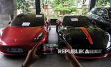 Jurnalis mengambil gambar mobil mewah sitaan usai konferensi pers pengungkapan kasus investasi bodong di Bareskrim Polri, Jakarta, Rabu (22/1/2025). Dittipideksus Bareskrim Polri berhasil mengungkap kasus investasi bodong robot trading NET89 dengan total 14 tersangka serta mengamankan barang sitaan berupa 5 buah mobil mewah dan uang tunai Rp52,5 miliar. Total aset yang diamankan senilai Rp1,5 triliun dari total korban penipuan investasi bodong sebanyak 6.000 orang. Aset-aset tersebut dikumpulkan dari berbagai wilayah di Tangerang hingga Bali. (FOTO : Republika/Thoudy Badai)