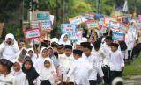 REPUBLIKA.CO.ID, KEDIRI -- Pelajar SD Negeri Tempurejo 1 membawa poster saat mengikuti pawai memperingati Isra Miraj di Kota Kediri, Jawa Timur, Kamis (23/1/2025).