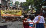 Sejumlah anak melintas di dekat spanduk penolakan eksekusi lahan di Jalan Sampurna, Kecamatan Medan Helvetia, Kota Medan, Sumatera Utara, Kamis (23/1/2025). Aksi tersebut merupakan wujud protes masyarakat sekitar atas rencana eksekusi yang akan dilakukan juru sita Pengadilan Negeri (PN) Medan terhadap 24 rumah diatas lahan seluas 18.151 meter persegi yang dianggap tidak sesuai prosedur dan dilakukan secara sepihak.  (FOTO : ANTARA FOTO/Fransisco Carolio)