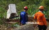 Petugas melihat bangunan rumah yang terdampak longsor di Dusun Jumok, Desa Sambirejo, Kecamatan Wonosalam, Kabupaten Jombang, Jawa Timur, Jumat (24/1/2025). Longsor yang dipicu curah hujan tinggi selama dua hari berturut-turut dan menyebabkan kondisi tanah tidak stabil itu mengakibatkan satu orang meninggal dan satu orang masih dalam pencarian. (FOTO : ANTARA FOTO/Syaiful Arif)