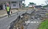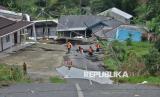 Relawan menunjukkan kerusakan dampak bencana tanah bergerak di kawasan dataran tinggi Dieng Desa Ratamba, Pejawaran, Banjarnegara, Jawa Tengah, Selasa (28/1/2025). Bencana tanah bergerak yang terjadi sejak (22/1) menyebabkan jalan raya amblas sedalam 1,5 - 2 meter seringa jalur Banjarnegara - Dieng lewat Pejawaran putus total, sedikitnya 15 rumah rusak parah dan 60 warga mengungsi ke tempat yang lebih aman. (FOTO : ANTARA FOTO/Anis Efizudin)
