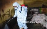 Petugas Dinas Peternakan Deli Serdang menyemprotkan cairan disinfektan usai pengambilan sampel darah ternak babi yang terindikasi penyakit flu babi atau African Swine Fever (ASF) di Gaperta Ujung, Deli Serdang, Sumatera Utara, Kamis (30/1/2025). Sampel darah tersebut akan diuji laboratorium guna mengetahui jenis virus dan penyakit hewan itu setelah kasus kematian 70 babi di lokasi tersebut. (FOTO : ANTARA FOTO/Fransisco Carolio)