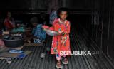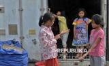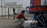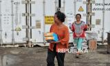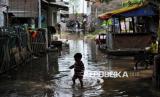 Anak bermain di sisa genangan bekas banjir di kawasan Kampung Sepatan, Cilincing, Jakarta utara, Jumat (31/1/2025). Warga Kampung Sepatan, RT 18/05, Rorotan, Cilincing memanfaatkan kontainer atau peti kemas yang kosong untuk dijadikan tenpat mengungsi sementara setelah kediamannya terendam banjir setinggi satu meter. Sebanyak 8 unit peti kemas sempat dijadikan warga sebagai tempat pengungsian, namun kini hanya tersisa 3 peti kemas yang diisi warga dan sebagian pengungsi telah kembali ke kediamannya ketika banjir berangsur surut. (FOTO : Republika/Thoudy Badai)