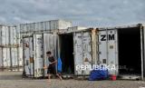 Pengungsi beraktivitas di peti kemas yang kosong Depo BCC di kawasan Kampung Sepatan, Cilincing, Jakarta utara, Jumat (31/1/2025). Warga Kampung Sepatan, RT 18/05, Rorotan, Cilincing memanfaatkan kontainer atau peti kemas yang kosong untuk dijadikan tenpat mengungsi sementara setelah kediamannya terendam banjir setinggi satu meter. Sebanyak 8 unit peti kemas sempat dijadikan warga sebagai tempat pengungsian, namun kini hanya tersisa 3 peti kemas yang diisi warga dan sebagian pengungsi telah kembali ke kediamannya ketika banjir berangsur surut. (FOTO : Republika/Thoudy Badai)