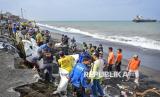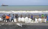 Sejumlah pekerja membuat tanggul penahan ombak di samping jalan yang rusak akibat diterjang gelombang tinggi di Lingkungan Bugis, Ampenan, Mataram, NTB, Senin (3/2/2025). Gelombang tinggi dan pasang yang terjadi sejak dua hari lalu tersebut mengakibatkan jalan rusak serta sejumlah rumah warga roboh akibat abrasi pantai. (FOTO : ANTARA FOTO/Ahmad Subaidi)
