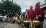 Sejumlah warga mengantre untuk mendapatkan gas elpiji tiga kilogram di Cibodas, Kota Tangerang, Banten, Senin (3/2/2025). Warga setempat mengeluhkan sulitnya mendapatkan elpiji tiga kilogram dalam beberapa hari terakhir dampak dari kebijakan baru yang melarang penjualan gas subsidi tersebut di tingkat pengecer dan mengharuskan membeli di pangkalan resmi. (FOTO : ANTARA FOTO/Putra M. Akbar)