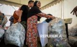 Warga meletakan sampah ke timbangan saat kegiatan Sembako Tukar Sampah di Alun-alun Teluk Naga, Kabupaten Tangerang, Banten, Selasa (4/2/2025). Kegiatan penukaran sampah rumah tangga yang sudah dipisahkan jenisnya dengan sembako tersebut untuk mengedukasi warga pentingnya pengelolaan sampah dalam pengembangan ekonomi sirkular. (FOTO : ANTARA FOTO/Putra M. Akbar)