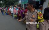 Polisi menjaga keamanan saat terjadi antrean pembelian gas elpiji 3 kg di Depok, Jawa Barat, Selasa (4/2/2025). Meski Presiden Prabowo sudah menginstruksikan agar pengecer boleh berjualan gas elpiji 3 kg seperti biasa dan akan diproses menjadi subpangkalan, antrean panjang warga untuk membeli gas elpiji 3 kg masih terjadi di Depok. (FOTO : ANTARA FOTO/Yulius Satria Wijaya)
