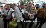 Anggota polisi mencoba menenangkan warga yang mengamuk saat antre membeli gas elpiji 3 kilogram di Karawaci, Tangerang, Banten, Selasa (4/2/2025). Warga tersebut mengamuk lantaran tidak terima dengan adanya larangan penjualan gas elpiji 3 kilogram di tingkat pengecer karena akan mempersulit warga mendapatkan gas elpiji tersebut. (FOTO : ANTARA FOTO/Yulius Satria Wijaya)