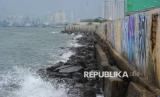 Deburan ombak di dekat tanggul pengaman laut di Muara Baru, Jakarta, Selasa (4/2/2025). Utusan Presiden Bidang Iklim dan Energi Hashim Djojohadikusumo menyampaikan keputusan Presiden Prabowo Subianto untuk membangun tanggul laut raksasa sepanjang 700 km. Tanggul itu akan memanjang mulai dari Banten sampai Jawa Timur. Proyek pembangunan tanggul laut raksasa diperkirakan memakan waktu antara 10 hingga 20 tahun. (FOTO : Republika/Prayogi)