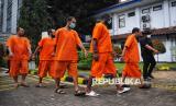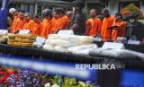 Sejumlah tersangka dihadrikan dalam konferensi pers pengungkapan jaringan narkotika dan pemusnahan barang bukti narkotika di Kantor BNN, Jakarta, Jumat (7/2/2025). BNN melakukan pemusnahan barang bukti hasil tindak pidana Narkotika dengan total barang bukti yang dimusnahkan sebanyak 27.108,05 gram sabu dan 3.866 gram Cathinone yang merupakan hasil pengungkapan 4 kasus tindak pidana narkotika dengan jumlah tersangka sebanyak 16 Orang. Dalam kesempatan tersebut BNN juga merilis pengungkapan sejumlah kasus narkotika dengan total barang bukti yang diamankan berupa 49.171,19 gram Sabu, 21.711,62 gram Ganja, 374,48 gram THC, 1.204,02 gram Hasis, 1.055,44 gram dan 113 butir Ekstasi, serta ganja sintesis seberat 53,2 gram. Barang bukti tersebut disita dari pengungkapan 46 Laporan Kasus Narkotika (LKN) dengan jumlah tersangka mencapai 87 orang, 3 diantaranya merupakan Warga Negara Asing (WNA). (FOTO : Republika/Prayogi)