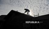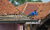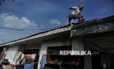 Warga melakukan perbaikan atap rumah yang rusak akibat diterjang angin puting beliung di Kampung Buwek, Desa Sumber Jaya, Kecamatan Tambun Selatan, Kabupaten Bekasi, Jawa Barat, Jumat (7/2/2025). Sebanyak 130 rumah di RW 28 Desa Sumber Jay serta satu sekolah SMP Al-Hidayah mengalami kerusakan parah akibat diterjang angin puting beliung pada Kamis (6/2) sekitar pukul 04.00 WIB pagi. Kerusakan tersebut diantaranya asbes dan genteng atap rumah yang tersapu angin serta tembok runtuh. Dalam peristiwa tersebut tidak terdapat korban, namun terdapat kerugian secara material. Warga berharap adanya bantuan dari pemerintah setempat untuk melakukan perbaikan rumah yang terdampak. (FOTO : Republika/Thoudy Badai)