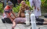 Petugas medis memberikan bantuan oksigen kepada seorang petugas kemanan yang terjebak di dalam gedung saat kebakaran di sebuah pusat perbelanjaan di Kendari, Sulawesi Tenggara, Selasa (11/2/2025). Api yang mulai berkobar pada pukul 06.30 WITA itu dapat dikendalikan setelah tujuh unit mobil pemadam kebakaran beserta 70 personel tiba di lokasi dan hingga saat ini penyebab kebakaran masih dalam penyelidikan. (FOTO : ANTARA FOTO/Andry Denisah)