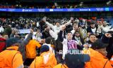 Suporter Real Madrid melakukan selebrasi pada pertandingan sepak bola leg pertama playoff Liga Champions melawan Manchester City di Stadion Etihad, Manchester, Inggris, Selasa (11/2/2025) waktu setempat. The Citizens takluk dari Real Madrid dengan skor 2-3. Dua gol Haaland di menit ke-19 dan 80 tak mampu menyelamatkan City dari kekalahan. Gol Madrid dicetak Kylian Mbappe menit ke-60, Brahim Diaz menit 89 dan Jude Bellingham pada menit 92. (FOTO : EPA-EFE/ADAM VAUGHAN)