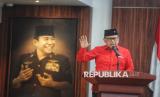 Ketua DPP PDIP Bidang Ideologi dan Kaderisasi Djarot Saiful Hidayat menyampaikan paparan saat pembekalan kepala daerah terpilih di Sekolah Partai PDI Perjuangan, Lenteng Agung, Jakarta, Rabu (12/2/2025). Pembekalan gelombang pertama yang digelar secara hybrid tersebut diikuti 142 kepala daerah yang baru pertama terpilih di Pilkada 2024. Dengan Pembekalan ini diharapkan kepala daerah dari PDIP tersebut memiliki bekal pengetahuan terkait kondisi geopolitik serta konsep NKRI. Selain itu pembekalan ini sebagai upaya saling mengintegrasikan pemikiran serta menunjukkan bagaimana visi-misi PDIP diturunkan berdasarkan amanat Pancasila dan UUD 45. (FOTO : Republika/Prayogi)
