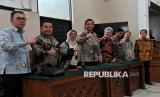 Kuasa hukum Sekjen PDI Perjuangan Hasto Kristiyanto, Ronny Talapessy (keempat kiri) bersama tim kuasa hukum lainnya saat mengikuti sidang putusan praperadilan di Pengadilan Negeri Jakarta Selatan, Jakarta, Kamis (13/2/2025). Hakim tunggal PN Jakarta Selatan Djuyamto menolak permohonan praperadilan Sekjen PDI Perjuangan Hasto Kristiyanto sehingga status tersangkanya dalam kasus dugaan suap penetapan pergantian antarwaktu (PAW) anggota DPR RI periode 2019-2024 dan perintangan penyidikan dianggap sah. (FOTO : Republika/Thoudy Badai)