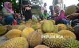 Pembeli memilih buah durian yang dijual saat Festival Durian Jatinom 2025 di Randulanang, Jatinom, Klaten, Jawa Tengah, Ahad (16/2/2025). Selain membagikan sebanyak 5.000 paket durian secara gratis, pada kegiatan festival tersebut juga sebagai tanda rasa syukur atas hasil buah durian yang baik serta untuk mengenalkan potensi buah durian Jatinom kepada masyarakat. (FOTO : ANTARA FOTO/Aloysius Jarot Nugroho)
