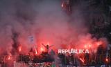 Suporter menyalakan flare usai laga lanjutan Liga 1 antara Persija Jakarta melawan Persib bandung di Stadion Patriot Candrabhaga, Bekasi, Jawa Barat, Ahad (16/2/2025). Persija gagal meraih kemenangan setelah ditahan Persib dengan skor 2-2. Gol Persija dicetak Gustavo Almeida di menit ke-33 dan Firza Andika menit 39. Sedangkan gol Persib dicetak Nick Kuipers menit 52 dan David da Silva menit ke-70. (FOTO : ANTARA FOTO/Akbar Nugroho Gumay)