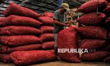 Pedagang bawang merah beraktivitas di Pasar Induk Kramat Jati, Jakarta Timur, Selasa (18/2/2025). Memasuki dua pekan jelang bulan Ramadan 1456 Hijriah, pasokan cabai, bawang merah dan bawang putih cenderung stabil untuk menjaga harga tidak mengalami kenaikan secara drastis. Untuk harga cabai rawit merah saat ini berkisar Rp65 ribu hingga Rp70 ribu per kilogram, harga cabai merah keriting Rp35 ribu hingga Rp45 ribu, sementara untuk harga bawang merah berkisar Rp30 ribu hingga Rp35 ribu dan bawang putih Rp40 ribu hingga Rp45 ribu. Dalam satu hari, pasokan bawang merah ke Pasar Induk Kramat Jati sekitat 89 ton dan cabai merah keriting 25 ton per hari. (FOTO : Republika/Thoudy Badai)