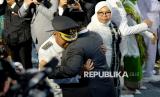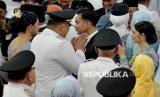 Presiden Prabowo Subianto memeluk Bupati Buton Selatan Muhammad Adios seusai upacara pelantikan di kompleks Istana Kepresidenan, Jakarta, Kamis (20/2/2025). Presiden Prabowo Subianto melantik 961 kepala daerah yang terdiri dari 33 gubernur dan 33 wakil gubernur, 363 bupati, 362 wakil bupati, 85 wali kota, dan 85 wakil wali kota dalam upacara tersebut. (FOTO : Republika/Edwin Dwi Putranto)