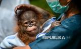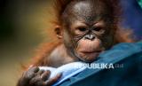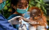 REPUBLIKA.CO.ID, BANDUNG -- Perawat bayi hewan menjemur anak Orang Utan Kalimantan (Pongo Pygmaeus) di Bandung Zoological Garden (Bazooga), Bandung, Jawa Barat, Jumat (21/2/2025).