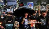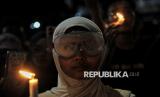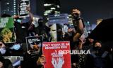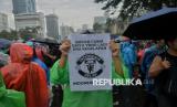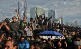 Peserta aksi dari sejumlah elemen masyarakat menggelar aksi bertajuk Indonesia Gelap di depan Patung Kuda Arjuna Wijaya, Jakarta, Jumat (21/2/2025). Dalam aksinya mereka menuntut pemerintah untuk mengkaji ulang Intruksi Presiden (Inpres) Nomor 1 Tahun 2025 terkait efisiensi belanja dalam pelaksanaan APBN dan APBD lantaran dinilai tidak efektif dan akan mengganggu kerja di sektor lainnya terutama sektor pendidikan dan kesehatan. Selain itu, massa aksi juga menuntut pemerintah untuk segera mengesahkan RUU Perampasan Aset, menolak Revisi Undang-Undang Minerba dan menghapus fungsi Dwifungsi ABRI serta mengevaluasi program MBG. Aksi tersebut berlangsung hingga sekitar pukul 21.00 WIB, sebelum akhirnya massa membubarkan diri. (FOTO : Republika/Thoudy Badai)