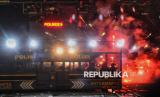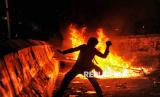Peserta aksi membakar pembatas jalan saat aksi bertajuk Indonesia Gelap di depan Patung Kuda Arjuna Wijaya, Jakarta, Jumat (21/2/2025). Dalam aksinya mereka menuntut pemerintah untuk mengkaji ulang Intruksi Presiden (Inpres) Nomor 1 Tahun 2025 terkait efisiensi belanja dalam pelaksanaan APBN dan APBD lantaran dinilai tidak efektif dan akan mengganggu kerja di sektor lainnya terutama sektor pendidikan dan kesehatan. Selain itu, massa aksi juga menuntut pemerintah untuk segera mengesahkan RUU Perampasan Aset, menolak Revisi Undang-Undang Minerba dan menghapus fungsi Dwifungsi ABRI serta mengevaluasi program MBG. Aksi tersebut berlangsung hingga sekitar pukul 21.00 WIB, sebelum akhirnya massa membubarkan diri. (FOTO : Republika/Thoudy Badai)