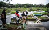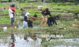 Sejumlah warga berziarah dimakam keluarganya yang tergenang air di Tempat Pemakaman Umum (TPU) Semper, Jakarta Utara, Ahad (23/2/2025). Ziarah kubur tersebut dilakukan umat Islam untuk menyambut bulan suci Ramadhan dengan membersihkan makam dan mendoakan anggota keluarga yang telah meninggal. Kegiatan ziarah kubur mulai terlihat ramai di sejumlah pemakaman umum sepekan menjelang bulan Ramadhan. (FOTO : Republika/Prayogi)