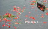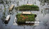 Taburan bunga yang ditabur warga di salah satu makam yang tergenang air di Tempat Pemakaman Umum (TPU) Semper, Jakarta Utara, Ahad (23/2/2025). Ziarah kubur tersebut dilakukan umat Islam untuk menyambut bulan suci Ramadhan dengan membersihkan makam dan mendoakan anggota keluarga yang telah meninggal. Kegiatan ziarah kubur mulai terlihat ramai di sejumlah pemakaman umum sepekan menjelang bulan Ramadhan. (FOTO : Republika/Prayogi)