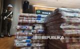 Petugas berdiri menjaga uang hasil sitaan saat konferensi pers kasus dugaan korupsi impor gula di Kejaksaan Agung, Jakarta, Selasa (25/2/2025). Kejaksaan Agung berhasil menyita uang senilai Rp565 miliar dari sembilan tersangka swasta dalam kasus dugaan korupsi impor gula di Kemendag periode 2015-2016. (FOTO : ANTARA FOTO/Nadia Putri Rahmani)