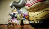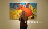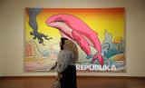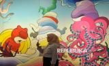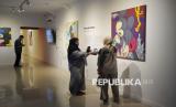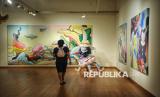 Pengunjung mengamati karya seniman kontemporer asal Bandung, Arkiv Vilmansa pada Pameran bertajuk Semesta Arkiv di Galeri Nasional Indonesia, Jakarta, Selasa (25/2/2025). Pameran SEMESTA ARKIV menampilkan perjalanan kreatif Arkiv Vilmansa yang karyanya dikenal melalui eksplorasi warna, karakter imajinatif, dan kolaborasi lintas disiplin. Perjalanan kreatif Arkiv tersebut disuguhkan melalui 100 lebih karya berupa lukisan, patung, instalasi, dan art toys, yang disajikan dalam lima tema yang tersebar di beberapa gedung Galeri Nasional Indonesia yaitu Metaphor of Memories, Monument of Sense (MICKIV HOPE X SUNARYO), Widya Segara (Wisdom of the Sea), Laut Semua Warna, dan Sintesa. Pameran akan tersebut berlangsung hingga 11 Mei 2025. (FOTO : Republika/Prayogi)