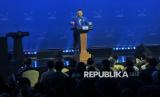 Ketua Umum Partai Demokrat Agus Harimurti Yudhoyono menyampaikan pidato politiknya saat penutupan Kongres ke-VI Partai Demokrat di Jakarta, Selasa (25/2/2025). Hasil Kongres ke-VI Partai Demokrat tersebut menetapkan Agus Harimurti Yudhoyono (AHY) kembali menjadi Ketua Umum Partai Demokrat periode 2025-2030 yang dipilih secara aklamasi. Penutupan kongres tersebut dihadiri juga oleh Presiden dan Wakil Presiden Republik Indonesia Prabowo Subianto dan Gibran Rakabuming Raka, pimpinan DPR dan MPR, sejumlah petinggi partai politik hingga jajaran menteri dan wakil menteri Kabinet Merah Putih. (FOTO : Republika/Thoudy Badai)