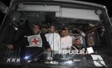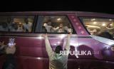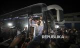 Sejumlah tahanan Palestina berada dalam bus saat mereka tiba di Jalur Gaza setelah dibebaskan dari penjara Israel menyusul perjanjian gencatan senjata antara Hamas dan Israel di Khan Younis, Jalur Gaza, Kamis (27/2/2025). Israel membebaskan sebanyak 620 tahanan Palestina yang sebelumnya ditunda pelepasannya. Para tahanan berasal dari berbagai lapisan masyarakat. Mereka diambil dari rumahnya, dari tempat penampungan sementara, dari sekolah-sekolah PBB, dari rumah sakit, dan tidak pernah dikenakan tuntutan hukum apapun. Pelepasan tahanan Palestina ini memungkasi fase pertama gencatan senjata di Gaza. (FOTO : AP Photo/Abdel Kareem Hana)
