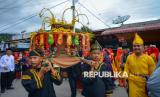 Sejumlah warga mengangkat dulang saat digelarnya tradisi Limau Baronggeh, di Sungai Pisang, Padang, Sumatera Barat, Kamis (27/2/2025). Limau Baronggeh yang sudah ditetapkan sebagai Warisan Budaya Tak Benda (WBTb) Indonesia itu merupakan tradisi silaturahmi antar suku di Sungai Pisang menyambut bulan Ramadhan 1446 Hijiryah, yakni dengan bersama-sama mengarak dulang yang dihias kemudian menyeka wajah dengan air perasan limau dan bedak sebagai simbol menyucikan diri. (FOTO : ANTARA FOTO/Iggoy el Fitra)