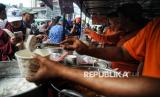 Pedagang melayani pembeli makanan untuk berbuka puasa di bazzar takjil Bendungan Hilir, Jakarta Pusat, Sabtu (1/3/2025). Bazzar musiman selama bulan suci Ramadhan tersebut menjadi pusat berburu beraneka ragam jajanan dan masakan dari berbagai daerah di Indonesia sebagai menu buka puasa. Adapun makanan yang dijual di lokasi ini beragam, seperti serabi, gorengan, lemang, kolak, mi bihun, hingga beragam es. Ada pula yang menjual gudeg, ayam goreng Kalasan, hingga lauk-pauk khas rumah makan Padang. Harga makanan yang dijual pun bervariatif dan terjangkau. Bazzar Takjil Ramadan Benhil ini mulai buka pukul 14.00 WIB hingga azan Magrib dan bakal tutup setelah Magrib. (FOTO : Republika/Prayogi)