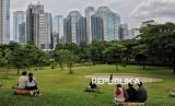 Sejumlah pengunjung memanfaatkan kawasan ruang terbuka hijau Hutan Kota GBK menjadi salah satu tempat untuk menunggu waktu berbuka puasa atau ngabuburit dengan pemandangan lanskap gedung perkotaan.