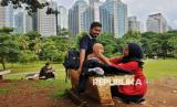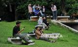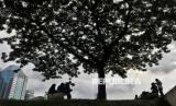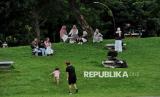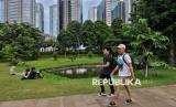 Pengunjung beraktivitas di area Huta Kota GBK di Jakarta, Ahad (2/3/2025). Sejumlah pengunjung memanfaatkan kawasan ruang terbuka hijau Hutan Kota GBK menjadi salah satu tempat untuk menunggu waktu berbuka puasa atau ngabuburit dengan pemandangan lanskap gedung perkotaan. (FOTO : Republika/Thoudy Badai)