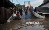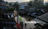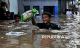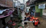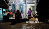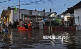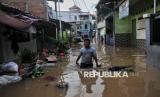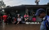 Warga beraktivitas saat pemukimannya terendam banjir di Kawasan Pejaten Timur, Jakarta Selatan, Senin (3/3/2025). Banjir setinggi kurang lebih 60 centimeter hingga 150 centimeter yang melanda kawasan tersebut disebabkan oleh meluapnya kali ciliwung imbas kiriman air dari kawasan Bogor. Sebelumnya, Badan Penanggulangan Bencana Daerah (BPBD) Provinsi DKI Jakarta mencatat 28 RT di wilayah Jakarta Selatan dan Jakarta Timur terendam banjir imbas luapan Kali Ciliwung pada Senin (3/3/2025) pagi ini. Diketahui bendungan Katulampa sempat mencapai ketinggian 220 Centimeter atau Siaga 1 dan diperkirakan air sampai di Jakarta pagi ini. (FOTO : Republika/Thoudy Badai)