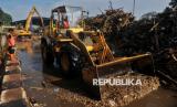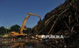 Petugas mengoperasikan alat berat untuk mengangkat sampah di Saringan Sampah TB Simatupang (SSTBS) Jakarta, Senin (3/3/2025). Tumpukan sampah kiriman dari kawasan Bogor tersebut terbawa arus hingga mengalir ke Kali Ciliwung akibat hujan deras di kawasan Bogor pada Ahad (2/3) malam. Dinas Lingkungan Hidup DKI Jakarta telah mengangkut sampah di lokasi tersebut sebanyak lebih dari 1.500 ton sejak pukul 02.00 WIB dini hari hingga saat ini. Tumpukan sampah didominasi oleh ranting dan dahan pohon. Dibutuhkan sebanyak 50 truk sampah untuk memindahkan sampah ke TPST Bantargebang. (FOTO : Republika/Thoudy Badai)