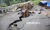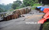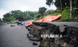 Suasana lokasi jalan yang ambles di Kawasan Batu Tulis, Kota Bogor, Jawa Barat, Selasa (4/3/2025). Kejadian yang terjadi sekitar pukul 01:30 dini hari tersebut mengakibatkan jalan utama menuju Stasiun Batu Tulis, Kota Bogor ambles sepanjang 50 meter dan arus lalu lintas ditutup total untuk sementara waktu. Jalan ambles tersebut dipicu hujan lebat yang turun di Bogor sejak Senin lalu, Wargapun diimbau terus waspada. (FOTO : Republika/Prayogi)