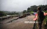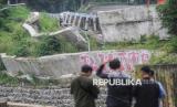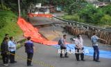 Petugas mengamati lokasi jalan yang ambles di Kawasan Batu Tulis, Kota Bogor, Jawa Barat, Selasa (4/3/2025). Kejadian yang terjadi sekitar pukul 01:30 dini hari tersebut mengakibatkan jalan utama menuju Stasiun Batu Tulis, Kota Bogor ambles sepanjang 50 meter dan arus lalu lintas ditutup total untuk sementara waktu. Jalan ambles tersebut dipicu hujan lebat yang turun di Bogor sejak Senin lalu, Wargapun diimbau terus waspada. (FOTO : Republika/Prayogi)