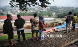 Warga mengamati lokasi jalan yang ambles di Kawasan Batu Tulis, Kota Bogor, Jawa Barat, Selasa (4/3/2025). Kejadian yang terjadi sekitar pukul 01:30 dini hari tersebut mengakibatkan jalan utama menuju Stasiun Batu Tulis, Kota Bogor ambles sepanjang 50 meter dan arus lalu lintas ditutup total untuk sementara waktu. Jalan ambles tersebut dipicu hujan lebat yang turun di Bogor sejak Senin lalu, Wargapun diimbau terus waspada. (FOTO : Republika/Prayogi)
