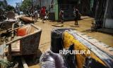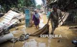 Warga membawa kasur berjalan melintasi lumpur sisa banjir di Perumahan Pondok Gede Permai, Bekasi, Jawa Barat, Rabu (5/3/2025). Banjir dikawasan tersebut sudah surut dan menyisakan lumpur berwarna kecoklatan di jalan dan rumah-rumah warga. Sebagian warga mulai membersihkan sisa-sisa lumpur di rumah mereka. Menurut petugaa banjir di kawasan Pondok Gede Permai mulai surut pada Rabu (5/3/2025) dini hari, pada pukul 01.00 WIB. Sebelumnya, banjir di titik ini jadi salah satu yang terparah dengan ketinggian air mencapai 3 meter. (FOTO : Republika/Prayogi)