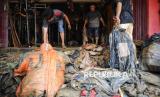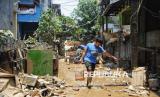 Warga membersihkan lumpur sisa banjir di Perumahan Pondok Gede Permai, Bekasi, Jawa Barat, Rabu (5/3/2025). Banjir dikawasan tersebut sudah surut dan menyisakan lumpur berwarna kecoklatan di jalan dan rumah-rumah warga. Sebagian warga mulai membersihkan sisa-sisa lumpur di rumah mereka. Menurut petugaa banjir di kawasan Pondok Gede Permai mulai surut pada Rabu (5/3/2025) dini hari, pada pukul 01.00 WIB. Sebelumnya, banjir di titik ini jadi salah satu yang terparah dengan ketinggian air mencapai 3 meter. (FOTO : Republika/Prayogi)